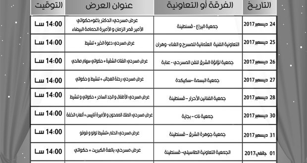 في إطار برنامجها الثقافي والفني لموسم 2017/ 2018، تنظم دار الثقافة مالك حداد أيام قسنطينة لمسرح الطفل للعطلة الشتوية .