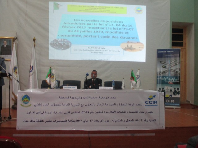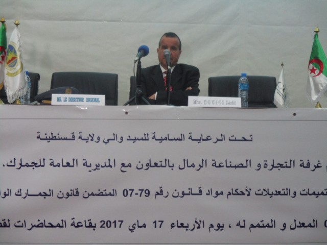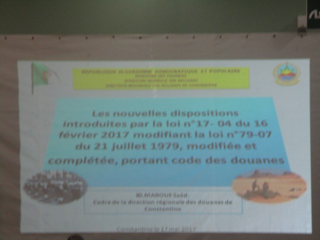 إحتضنت دار  الثقافة مالك حداد يوم الأربعاء 17 ماي 2017 لقاء إعلامي جهوي حول التتميمات والتعديلات لأحكام مواد قانون رقم 07.79 المتضمن قانون الجمارك الواردة في نص القانون الجديد رقم 04.17 المعدل والمتمم له، من تنظيم المديرية العامة للجمارك بالتعاون مع غرفة التجارة والصناعة الرمال.