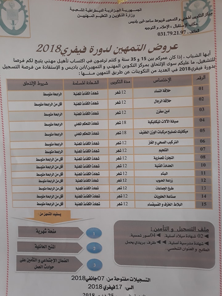 مديرية التكوين والتعليم المهنيين لولاية قسنطينة أيام مفتوحة على التكوين المهني من 28 إلى 30 جانفي 2018 2018-01-29 admin tweet